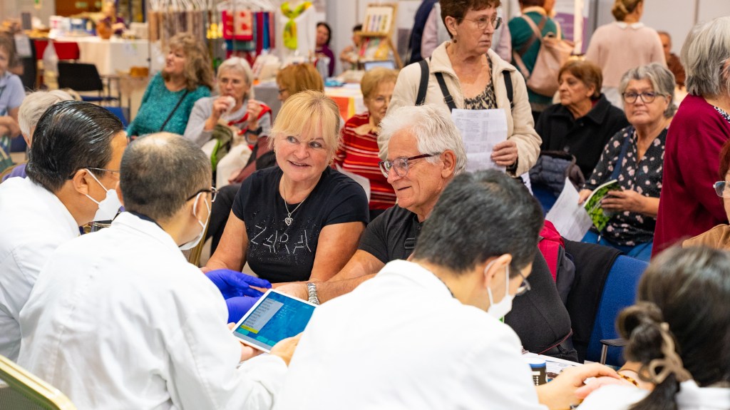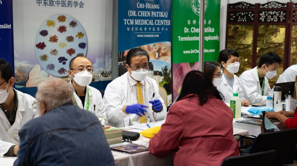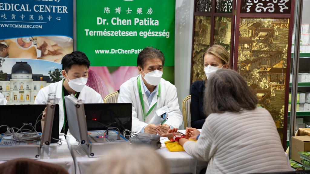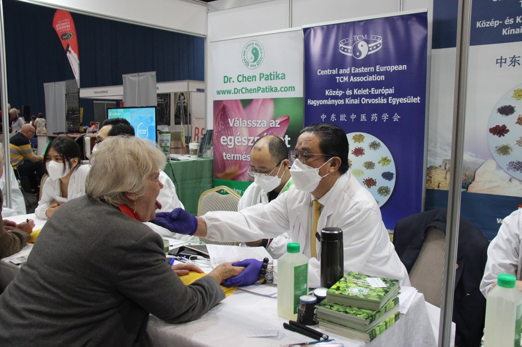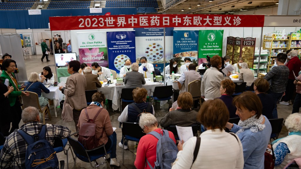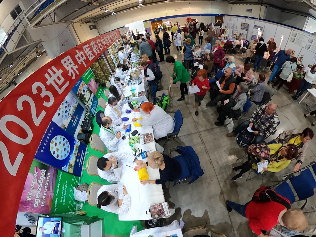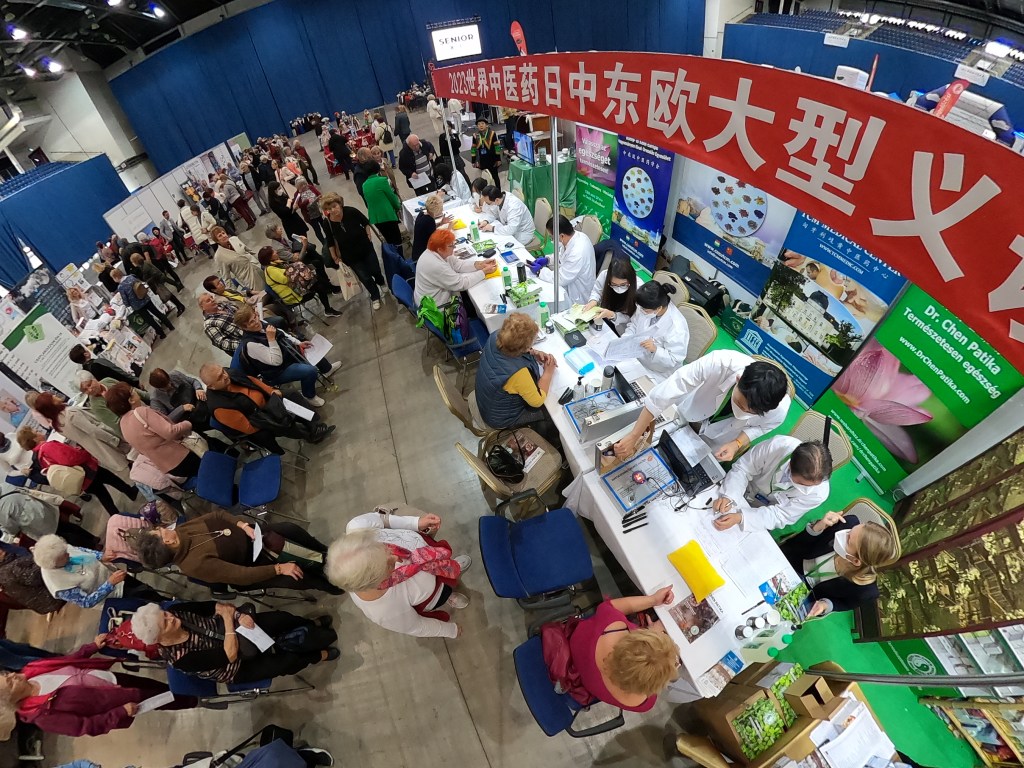2023年10月27至28日在位于匈牙利首都布达佩斯BOK体育中心,来自匈牙利各地和周边国家的退休人员及残障人士在中医义诊台人头涌动排起了长长的队伍。来自匈牙利中东欧中医药学会和匈牙利岐黄中医药中心的中医师们正在为他们把脉、问诊、仔细询问身体状况,为他们制定辨证论治的个人防治方案。